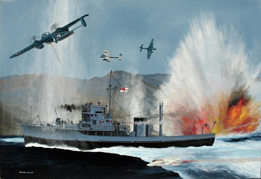 In early evening, as she approached Leros BYMS 2072 was attacked by the Luftwaffe. She took immediate evasive action, with four bombs narrowly missing her. Out of sight, and unheard above the noise of the ship’s engines, four German DO-217 bombers, armed with eight glider bombs, attacked.