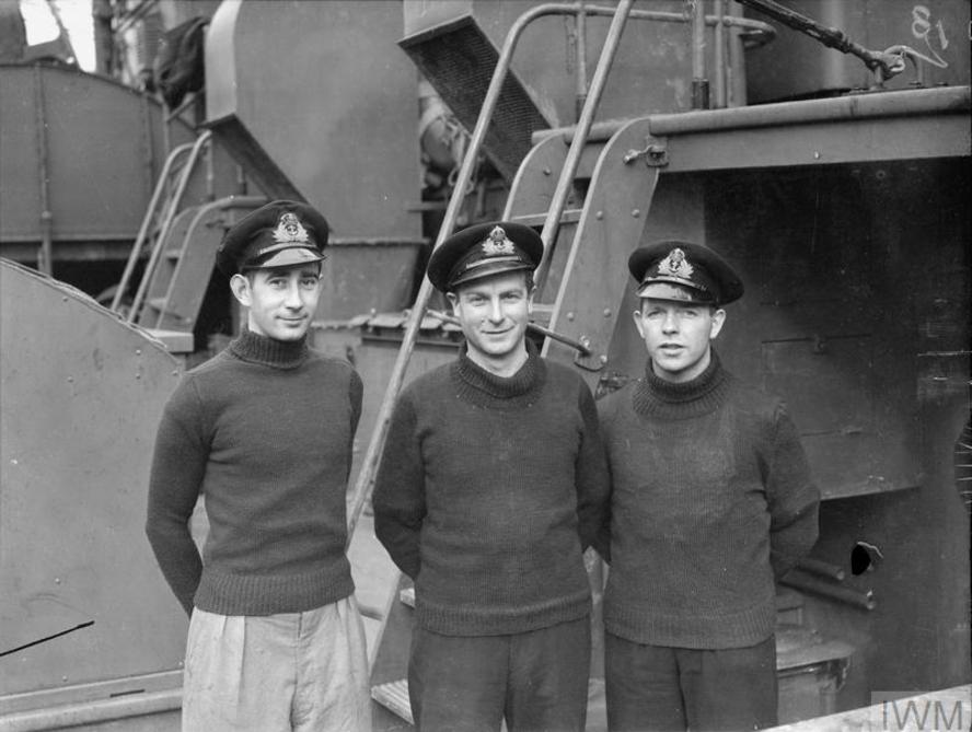 Officers of BYMS 2080 in Londonderry after crossing the Atlantic from the USA. Left to right: Sub Lieut R H Cragg, RNVR, of Brighton; Lieut P K Martin, RNR, of Hailsham, Sussex; and Sub Lieut F K D Saunders, RNVR, of London.