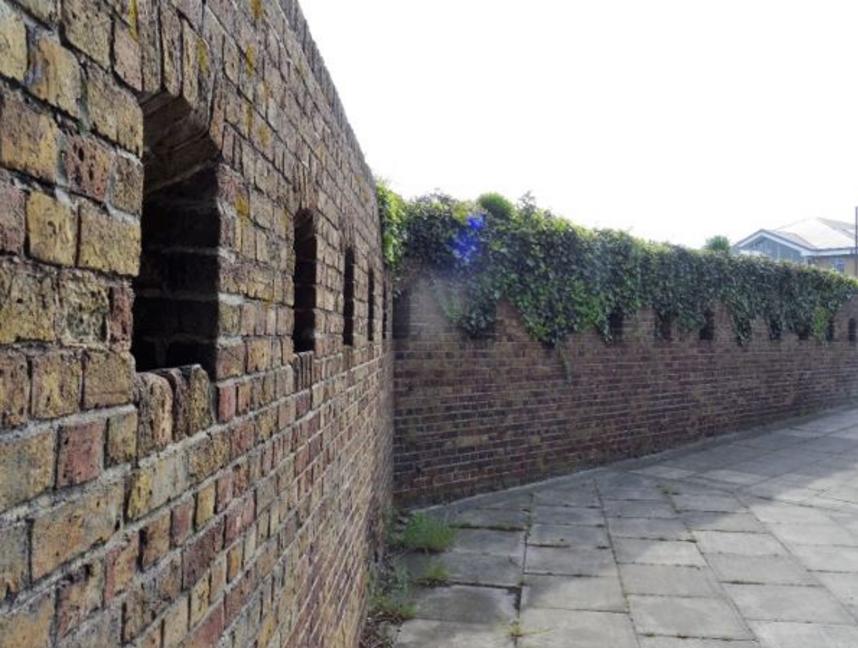 ONE: The Ravelin Wall. Built as part of the Sheerness Line defences in 1816, the Ravelin Wall is a brick built musketry wall, 0.74 metres thick and 2.42 metres high, pierced by gun loops covering the approaches to the Ravelin.