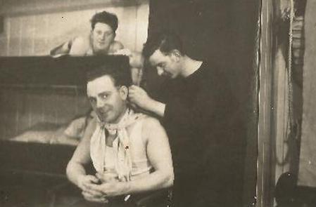 Charlie having a go at Bob Martin's hair in the mess deck. Dec 44.